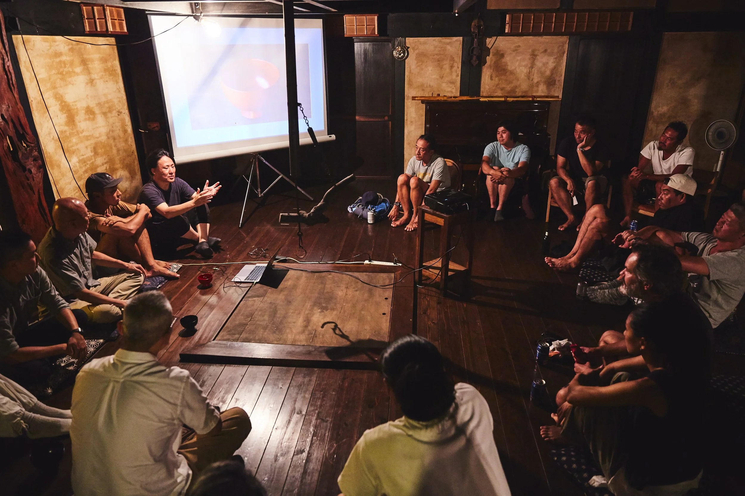 ▲ドキュメンタリーフィルム「BEYOND TORADITION」も上映。上映後、ビールを片手に、漆のこと、サーフィンのこと、工芸のこと、環境のことを語り合いました。