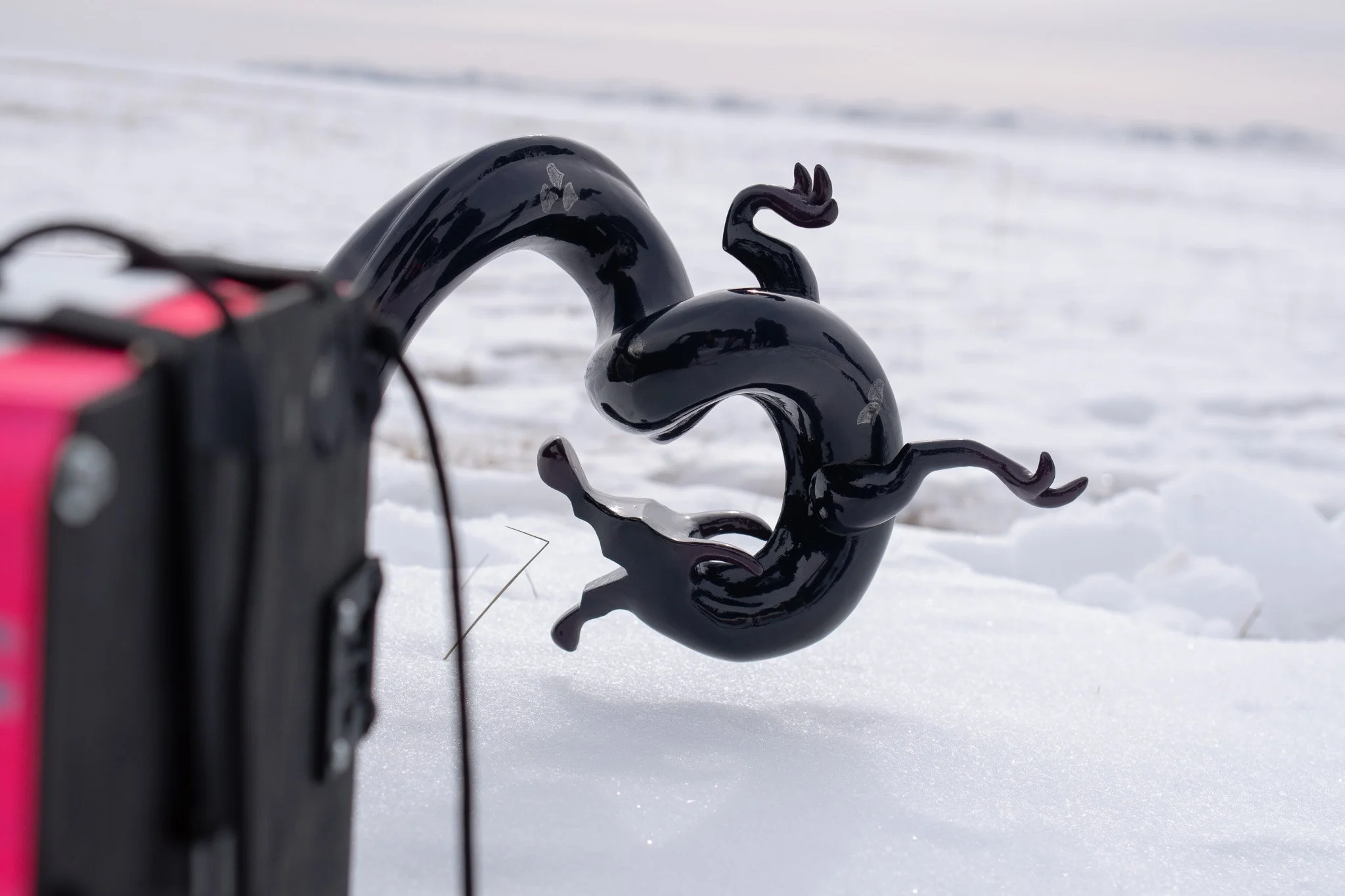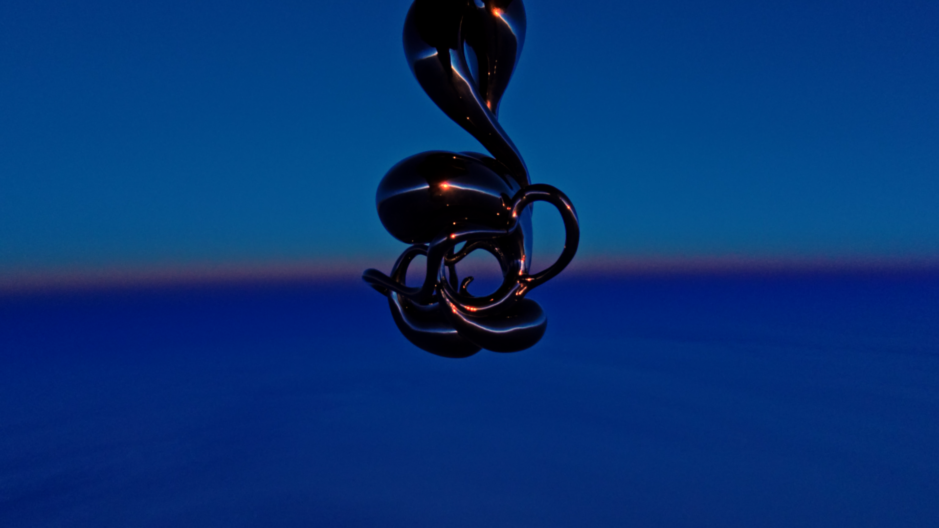 今回、宙を舞った漆アート作品は、この3月に京都市立芸術大学を卒業した久保尚子さんと糟野日向子さんが手掛けた2作品。久保さんは、漆黒の表面に成層圏の光や景色を映し込むことで、宇宙を纏う造形を演出。糟野さんは、広大な宙で舞い踊る龍の姿を表現したといいます。