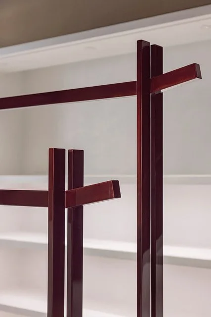Materials: Steel garment rack Specifications: Korin style, polished vermilion Urushi finish Client: Katayama Bunzaburo Shoten Co., Ltd. Direction: Pranks inc. Design: GRIP&Co. LLC Shop construction: Kobayashi Komuten (founded in the first year of the Genji era) Photography: Toshihide Kajiwara