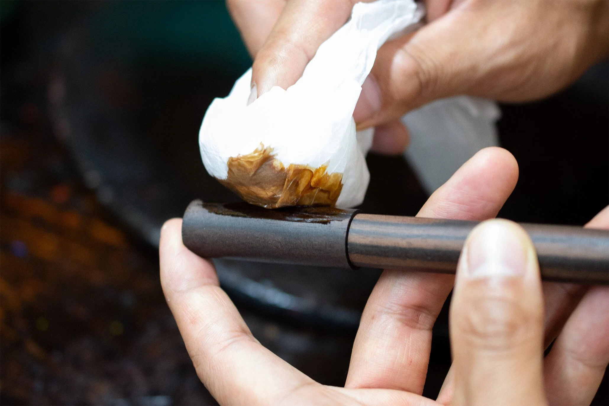 TAG STATIONERYが、手がける黒檀万年筆「文染」は、植物由来の天然染料インクを使うオリジナルブランド。高級木材の黒檀をボディに採用したシンプルで重厚感ある万年筆。ワークショップでは、その黒檀のボディに拭き漆を施します。当日は拭き漆1回のみとなりますが、お持ち帰り頂き、ご自身で拭き漆を繰り返して頂ければ、より漆独特の艶、質感が生まれ、人の手に馴染む唯一無二の漆万年筆が完成します。そして、使い込めば使い込むほど、味わい深い艶や質感に育つ。そんな漆の経年変化もお楽しみ頂けます。